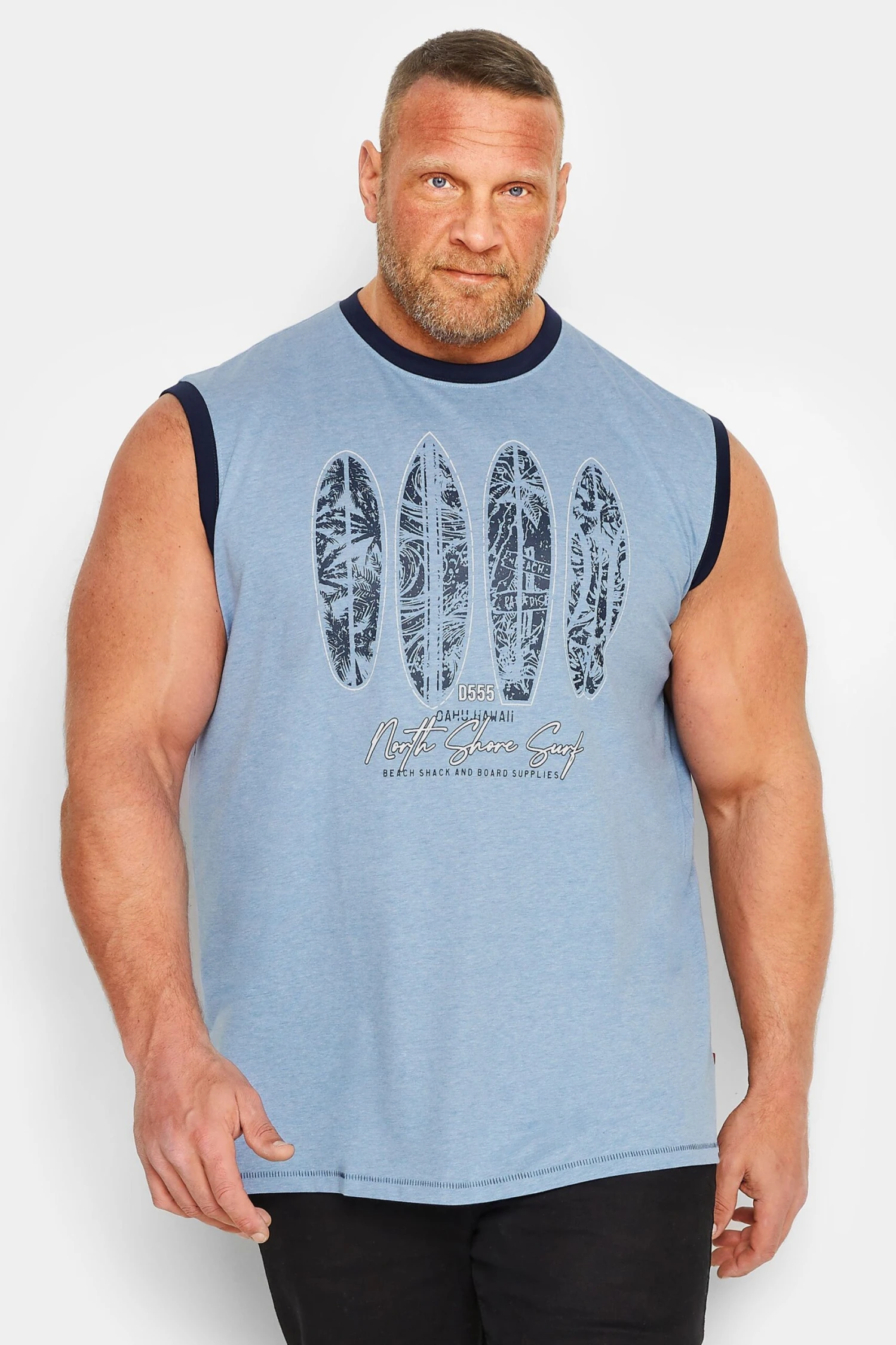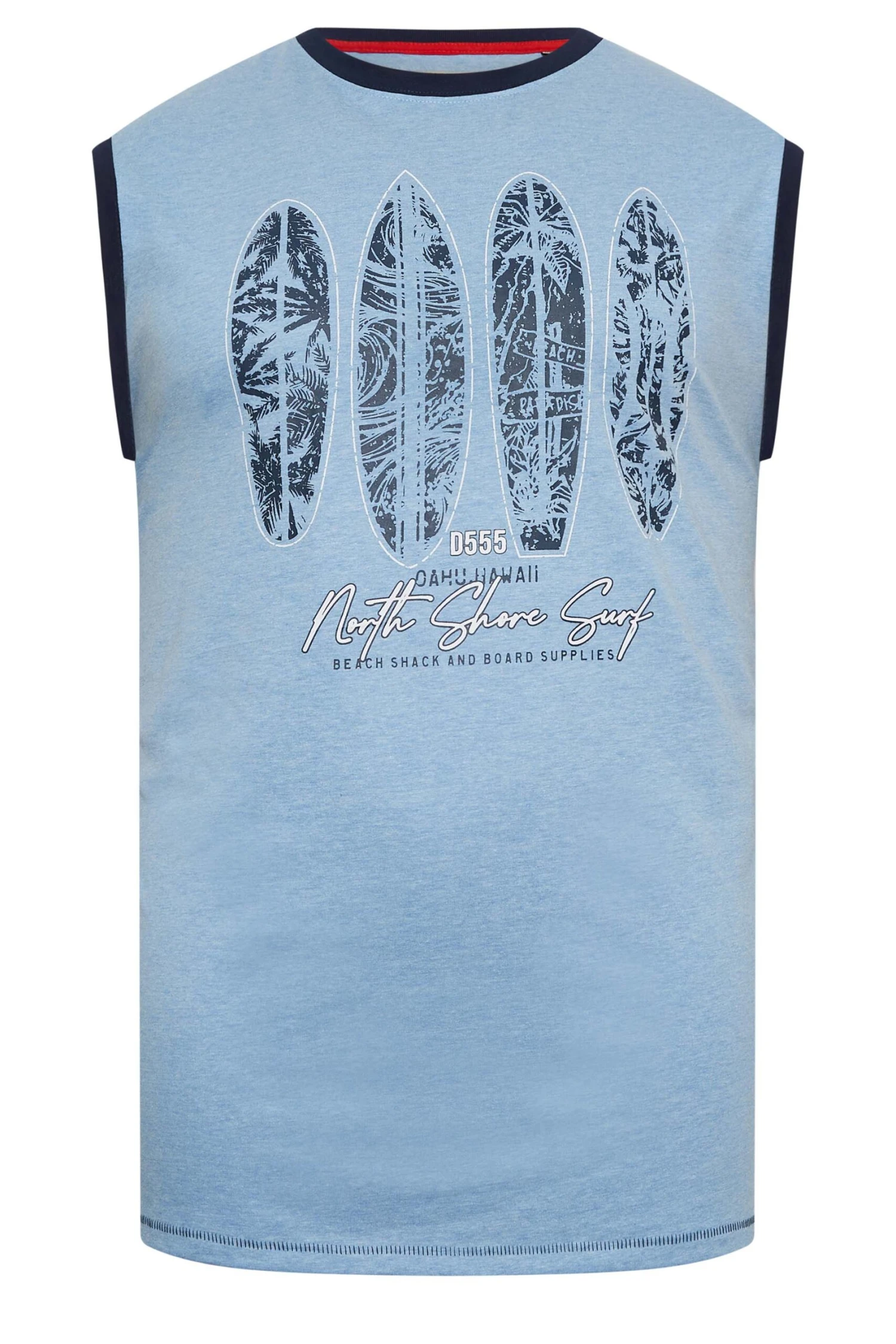 Get ready for summer with this D555 vest top. Constructed from a cotton blend fabric, it features a surfboard print with a crew neckline in a sleeveless design. Pair with shorts and trainers for a casual holiday outfit.