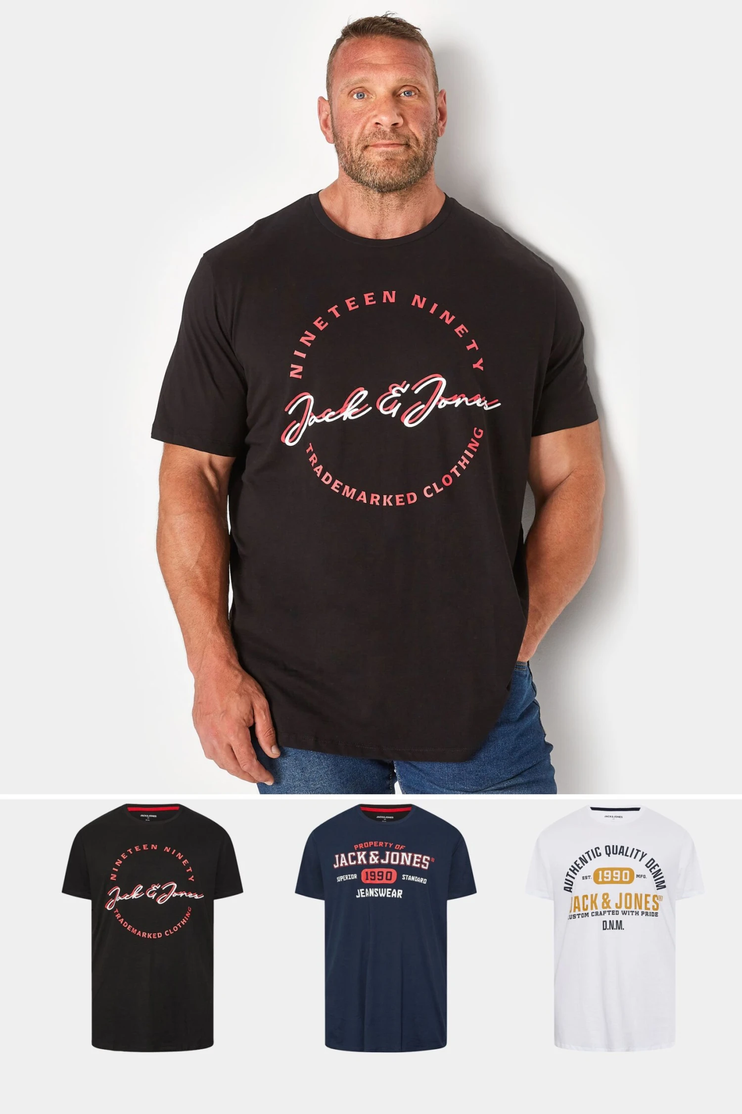 Update your wardrobe with this 3 pack of Jack & Jones t-shirts. Made from 100% cotton, they feature short sleeves, a crew neckline and a printed logo design in colours black, white and navy blue. Pair with jeans and trainers for a casual look for the weekend.